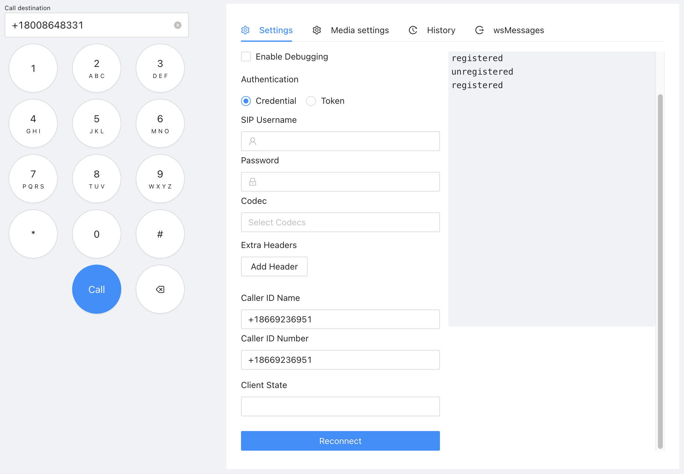 Alternatively, register this client with the credentials of the SIP connection created earlier. You may dial the phone number directly from your mobile device.